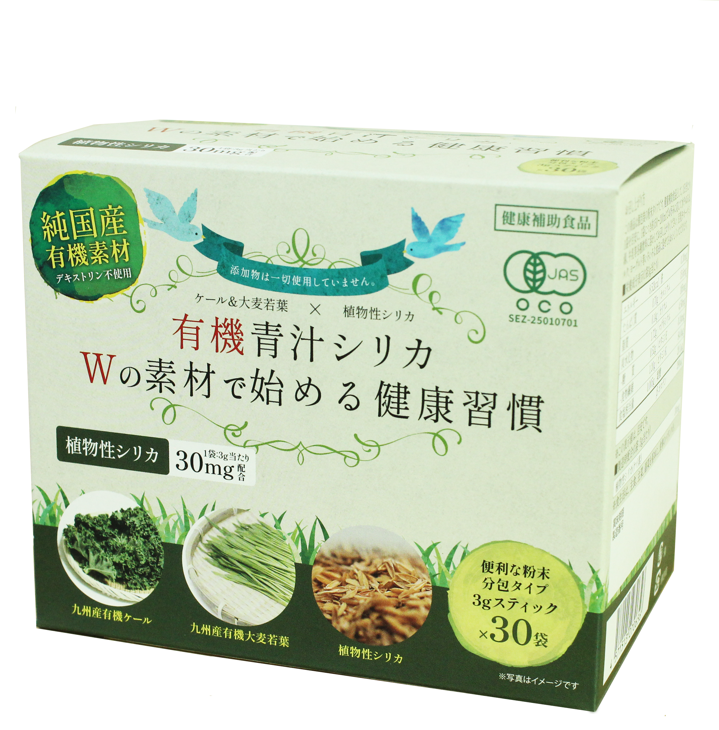 有機大麦若葉末(有機大麦若葉(九州産))、有機ケール末(有機ケール(九州産))、植物性シリカ末(国内製造)